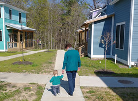 Our cohousing neighborhood is intentionally designed, with private homes clustered around shared spaces. Each single-family home has traditional amenities, including a private kitchen, storage, and porch. Our shared spaces include a common house, with a large kitchen and dining area, basement storage, and recreational spaces. Shared outdoor spaces include a picnic shelter in the center of the community, parking, walkways, open green space, a mail kiosk, bike storage shed, and a vegetable and flower garden. Neighbors also have access to shared resources like tools and lawnmowers. The community also includes a two-unit guest house, where guests of residents are welcome to stay when visiting.